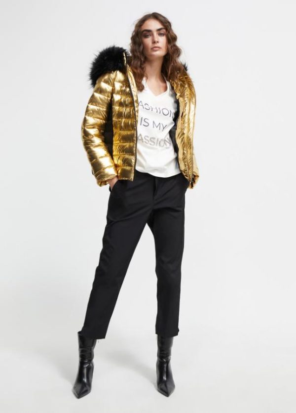 Chaqueta tipo anorak efecto metalizado. Capucha de pelo extraíble. Cierre con cremallera frontal de doble carro. Tejidos laterales a contraste. Puños de punto tipo mitones.