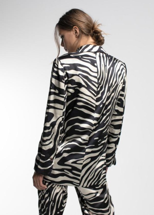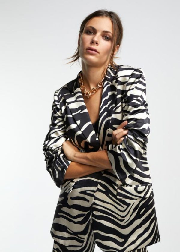 Blazer largo de estampado animal. Cuello solapa y manga larga. Falso bolsillo con tapete en delantero y cierre frontal con botón.