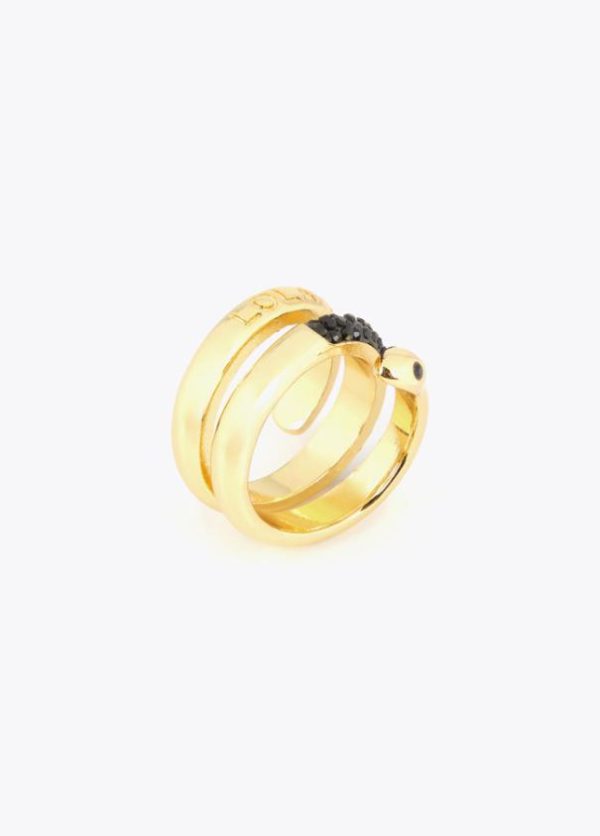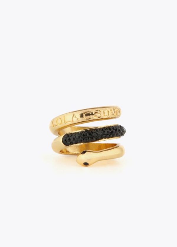 Anillo dorado modelo serpiente con piedras brillantes y logotipo grabado.