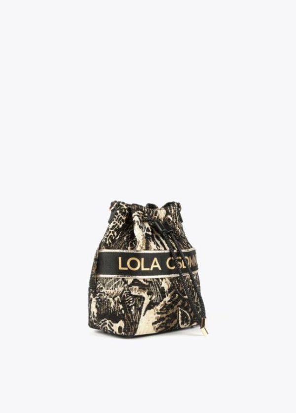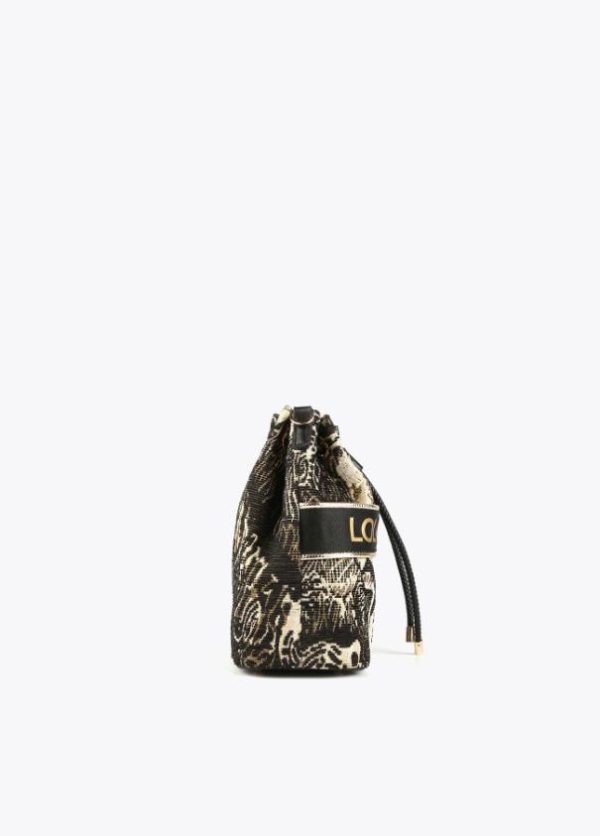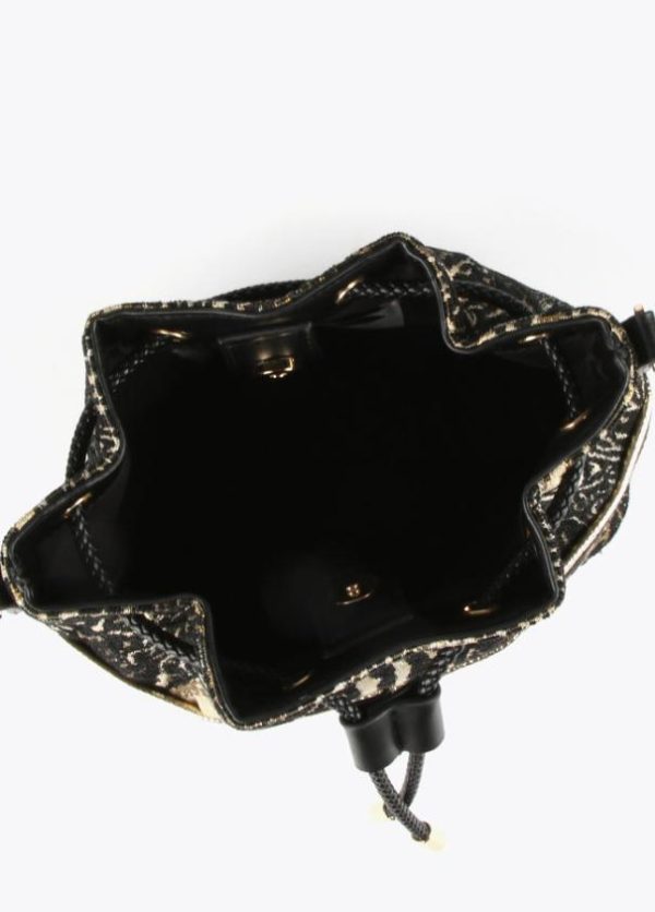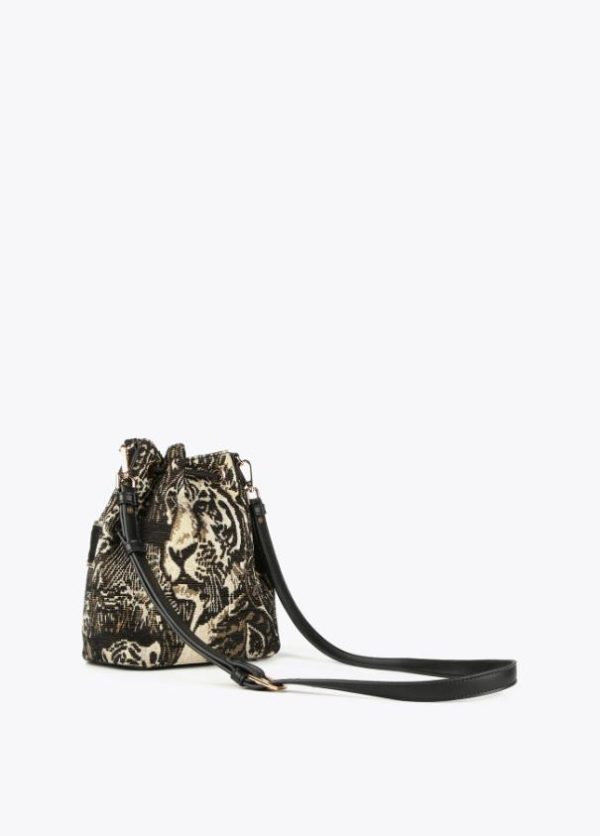 Bolso formato saco de estampado animal. Asas de mano y asas de hombro estilo bandolera con detalle metalizado. Cierre con cordón ajustable en efecto piel.