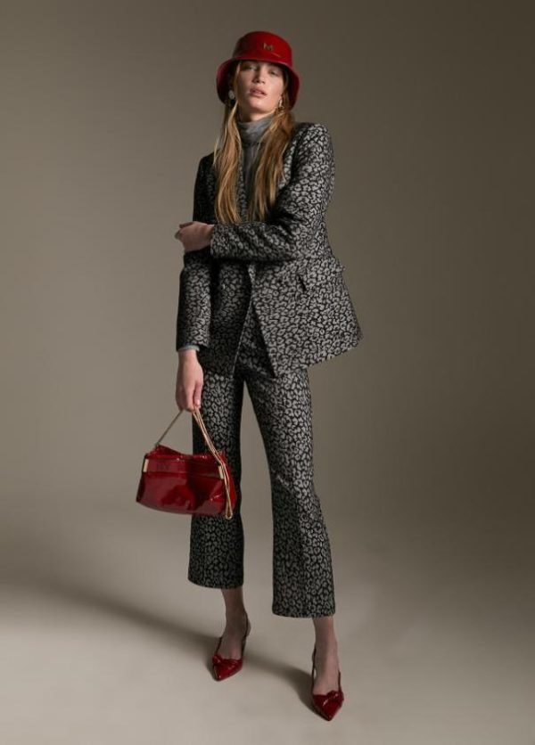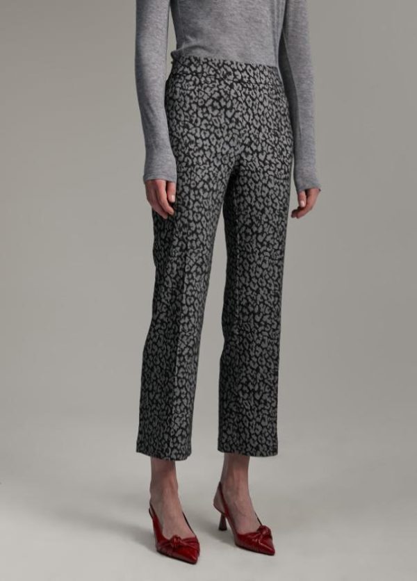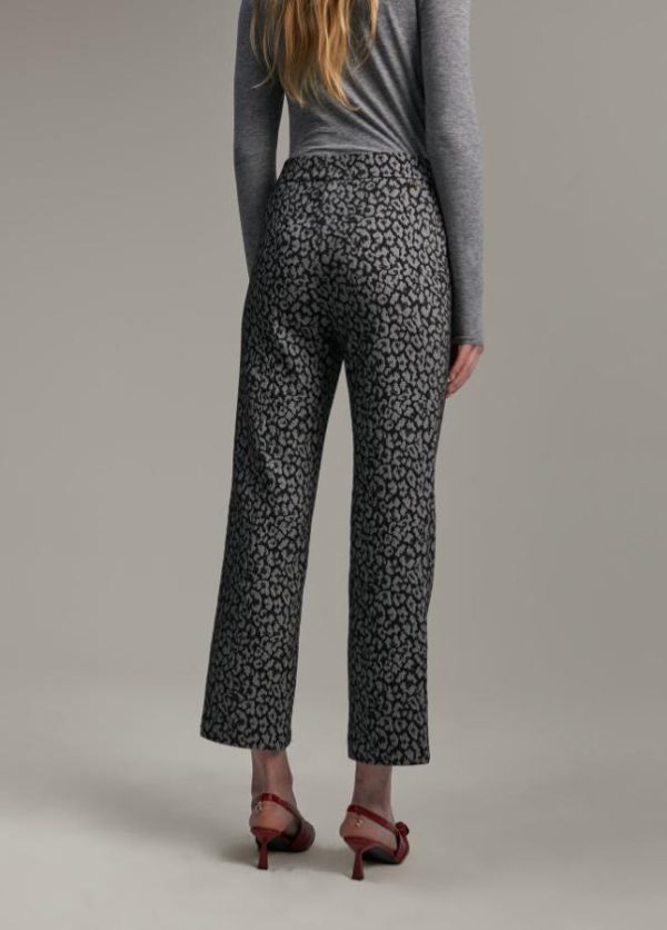 Pantalón jacquard estampado en animal print bicolor. Cerrado con cremallera lateral.