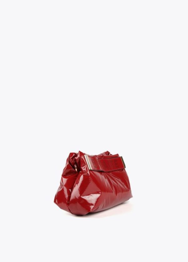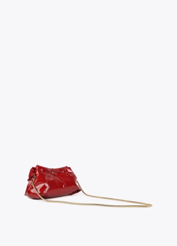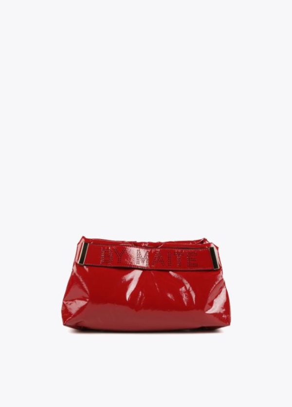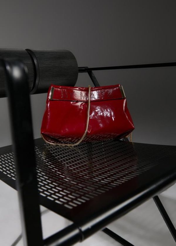Bolso tipo bandolera efecto charol brillante con asa bandolera de cadena extraíble y cinta logotipada en parte frontal. Cierre con botón imantado y bolsillo interior.