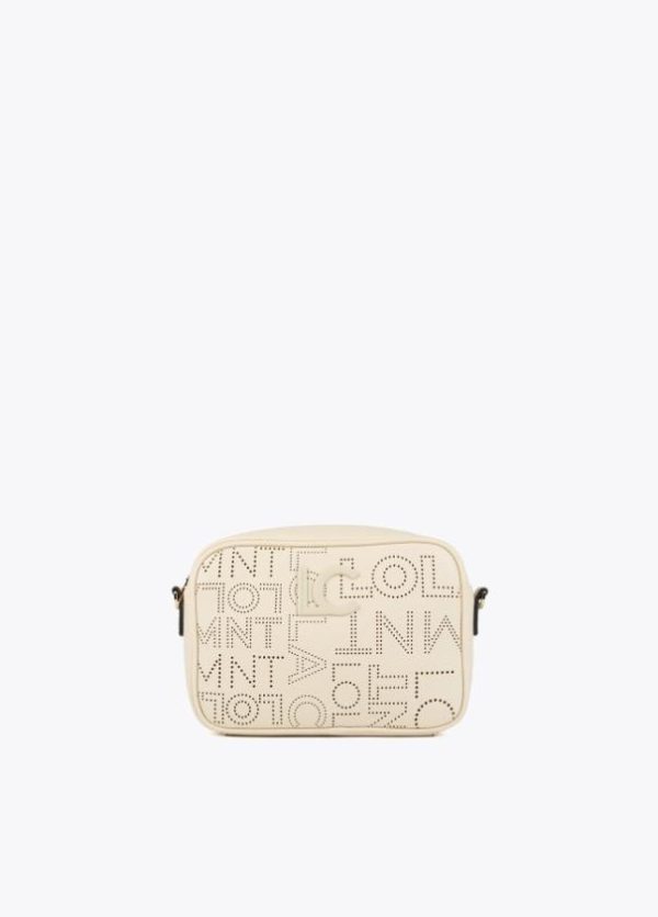 Bolso tipo bandolera con logotipo troquelado y logo lacado al tono en zona frontal. Cierre de cremallera y asa bandolera ajustable y extraíble.