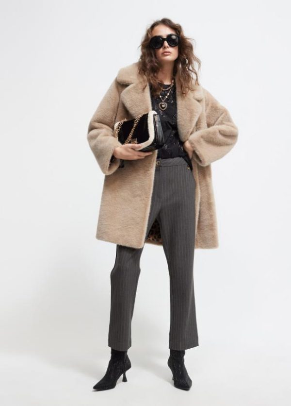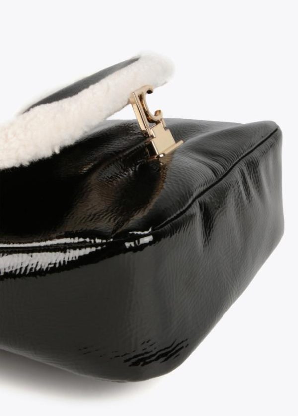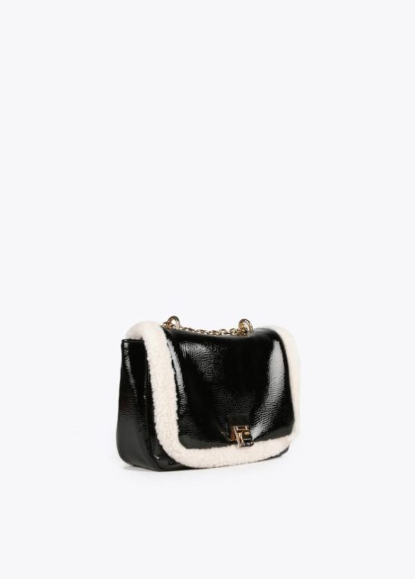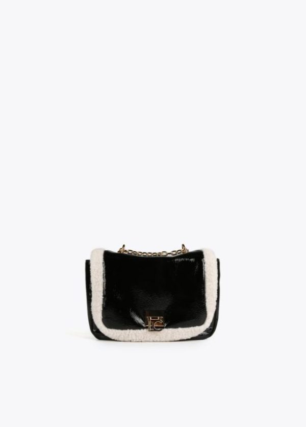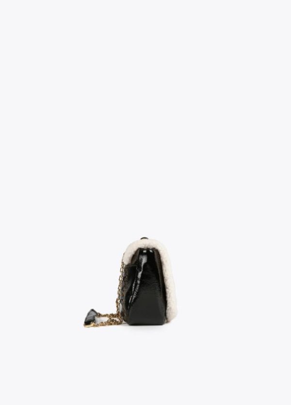 Bolso en formato bandolera de efecto piel con tejido exterior combinado en borreguito. Asa de hombro en cadena dorada combinada con detalle protector. Cierre de hebilla con detalle de logo metalizado.