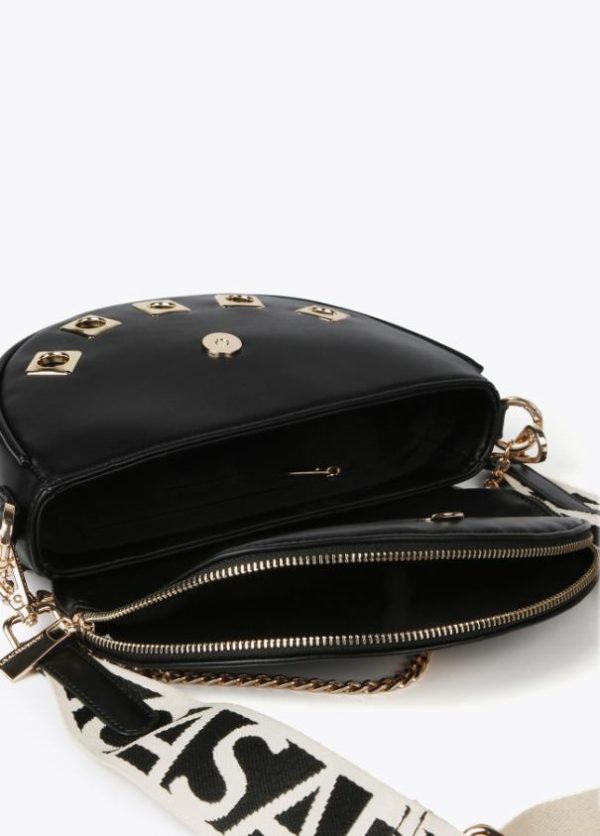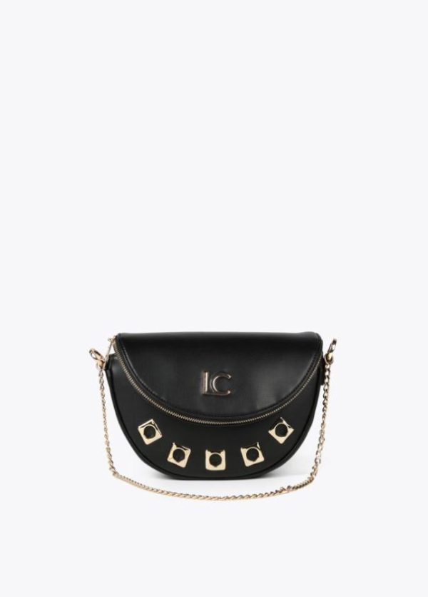 Bolso bandolera con detalles dorados y solapa con bolsillo cerrado. Dos asas, bandolera ajustable y de hombro en cadena dorada.
