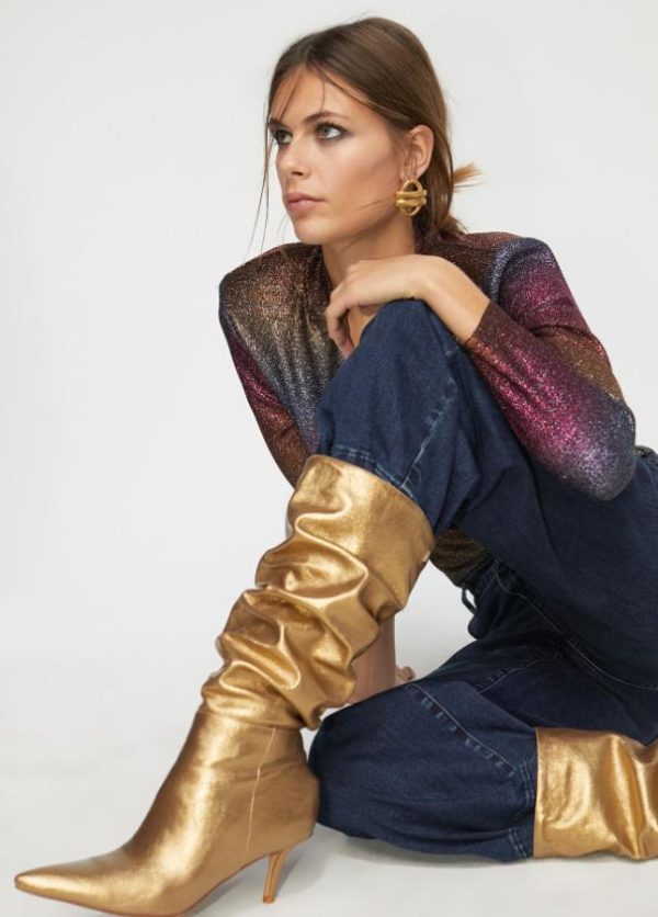 Bota de tacón con caña alta fruncida y letras logo en laterales.