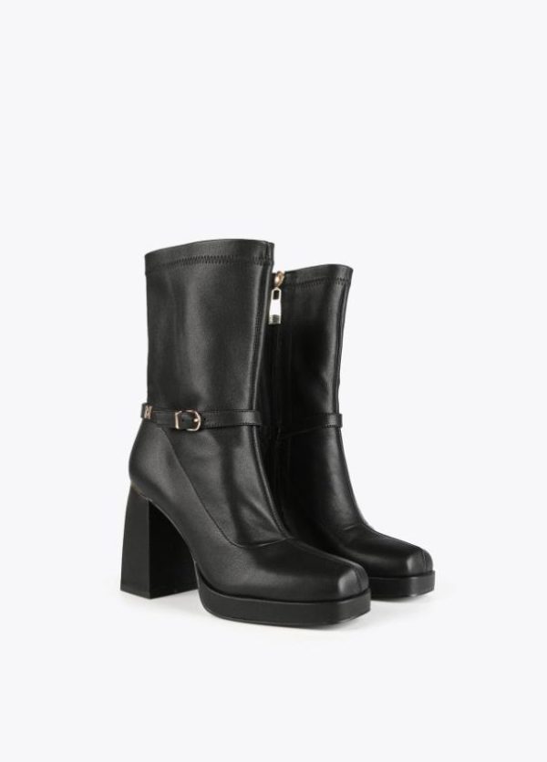 Botín de caña media y tacón alto con detalle hebilla y letra M dorada. Cierre de cremallera en lateral interior.