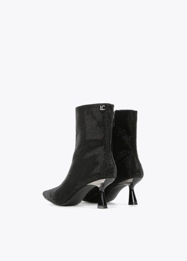 Botín negro de tacón fino y efecto brillo. Cierre de cremallera lateral y detalles de logo metalizado. Acabado en punta.