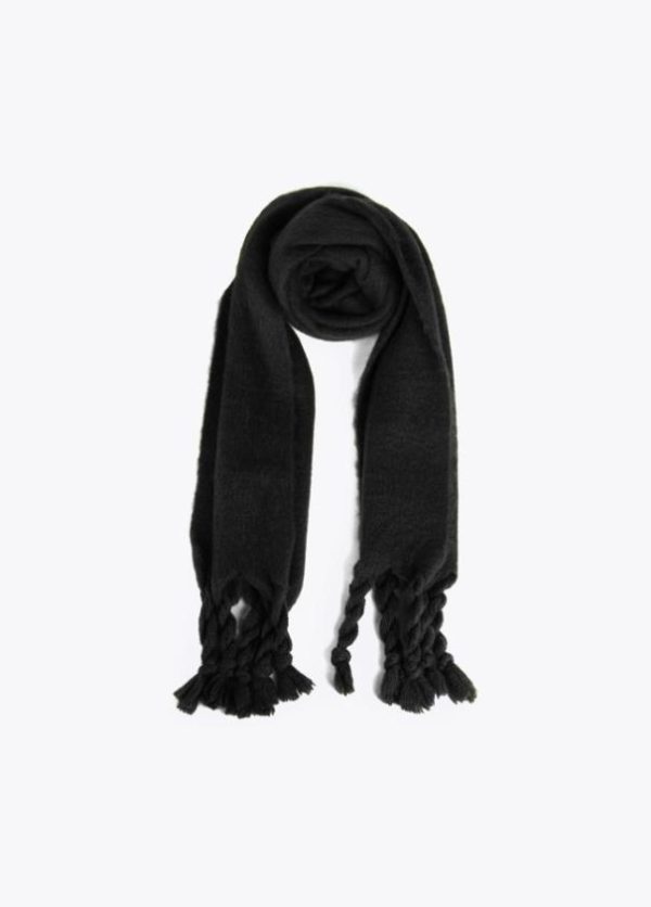 Bufanda unicolor con flecos trenzados en extremos.