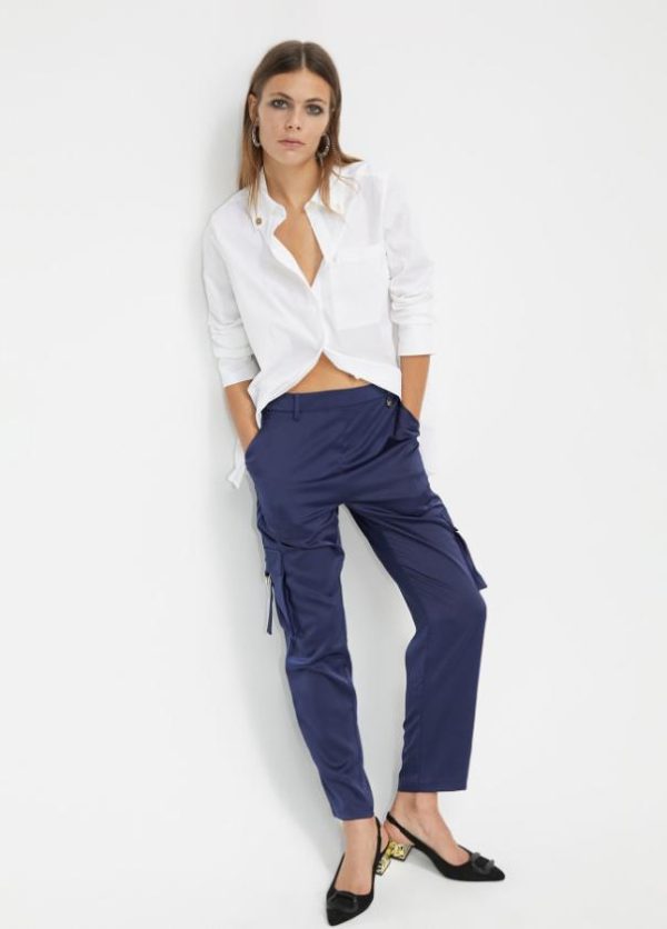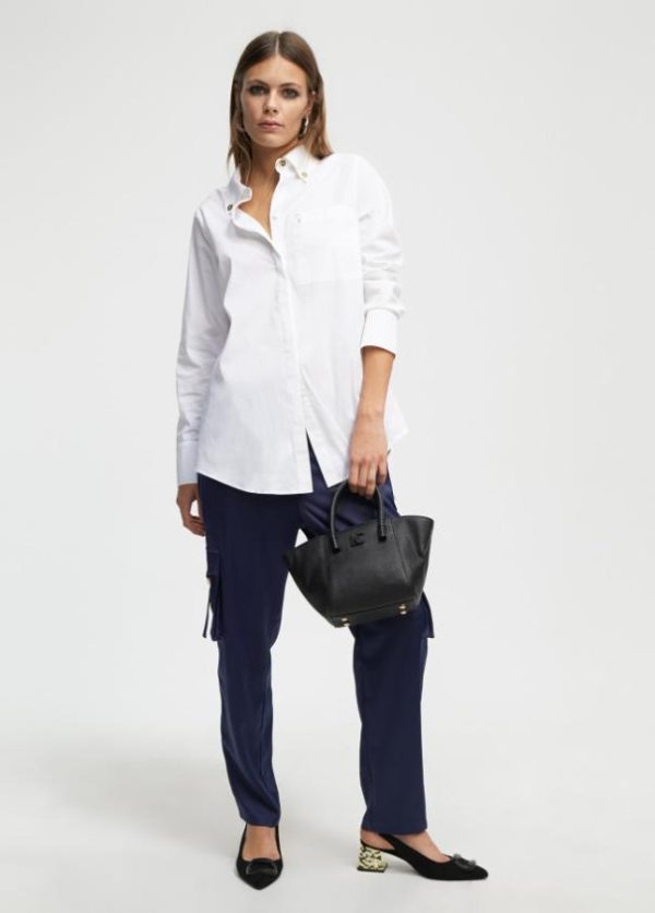 Camisa con botón metálico en cuello. Puños camiseros. Cerrada con botones bajo tapete. Pliegue en espalda con detalle logo a contraste.