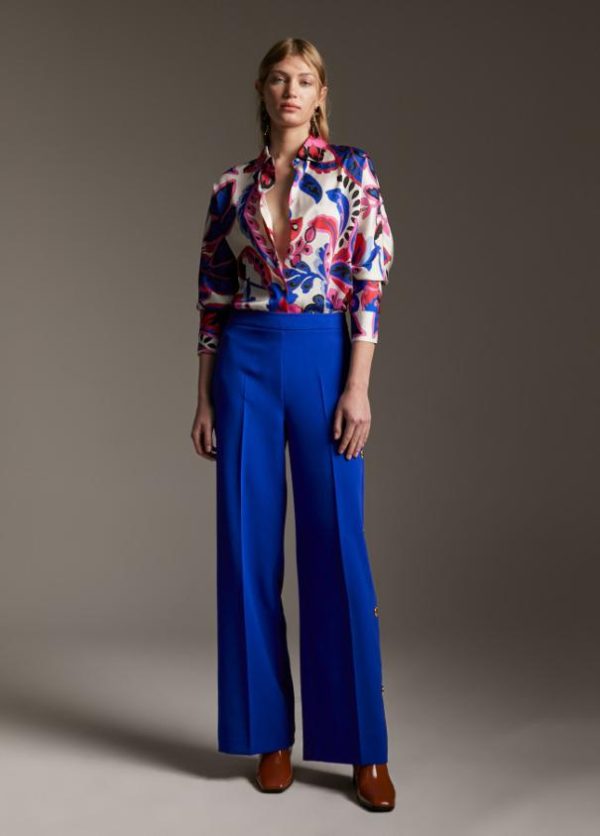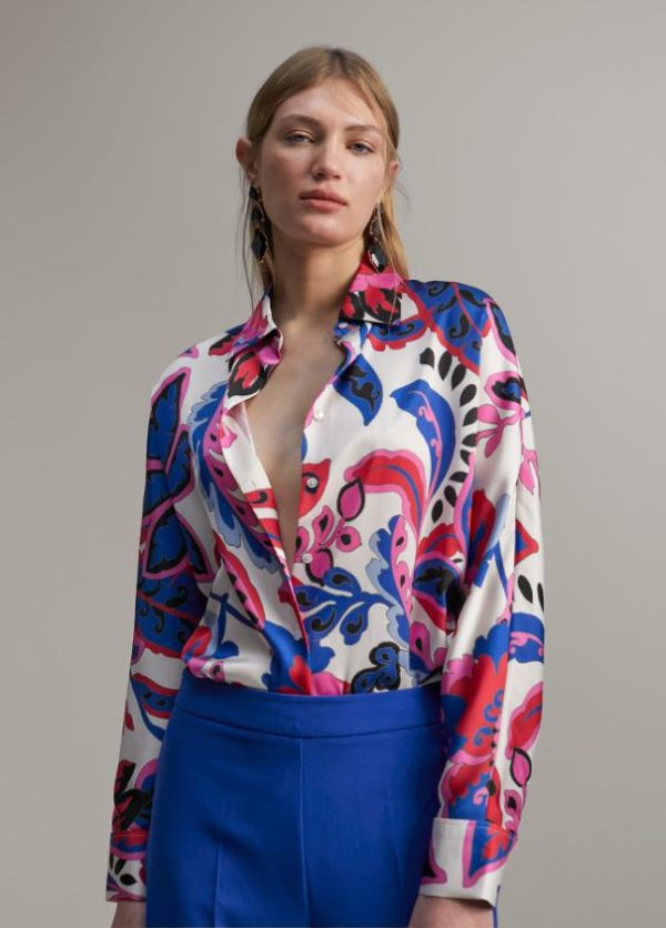Camisa efecto satén estampada en paisley. Cuello y puños camiseros. Cerrada con botones.