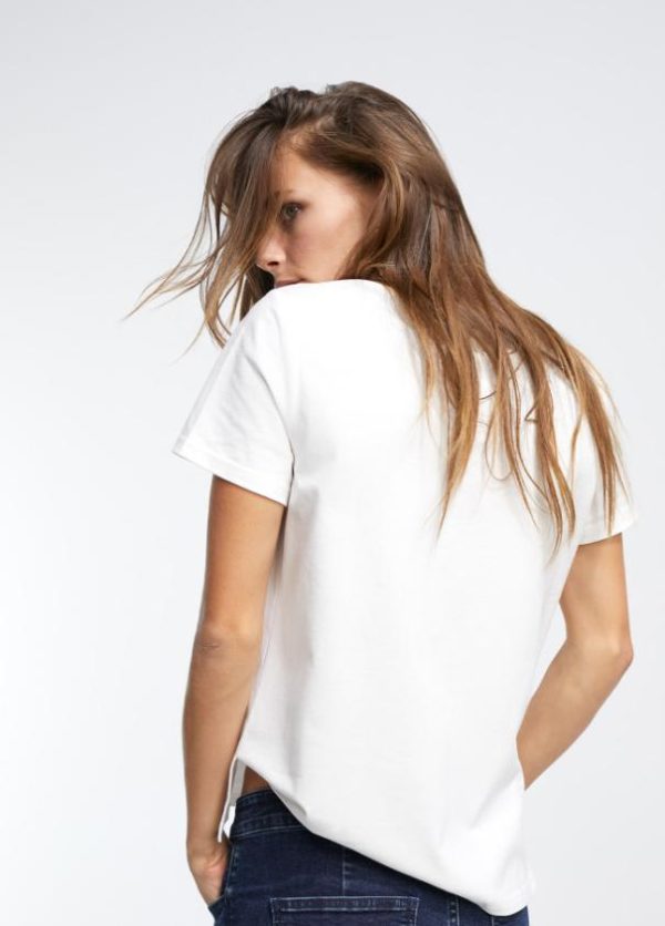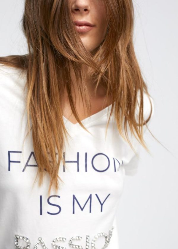 Camiseta de manga corta y cuello pico. Detalle de pedrería en frontal.