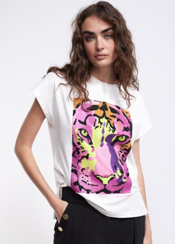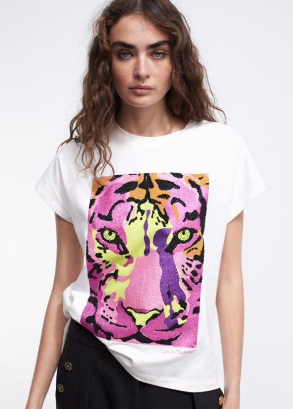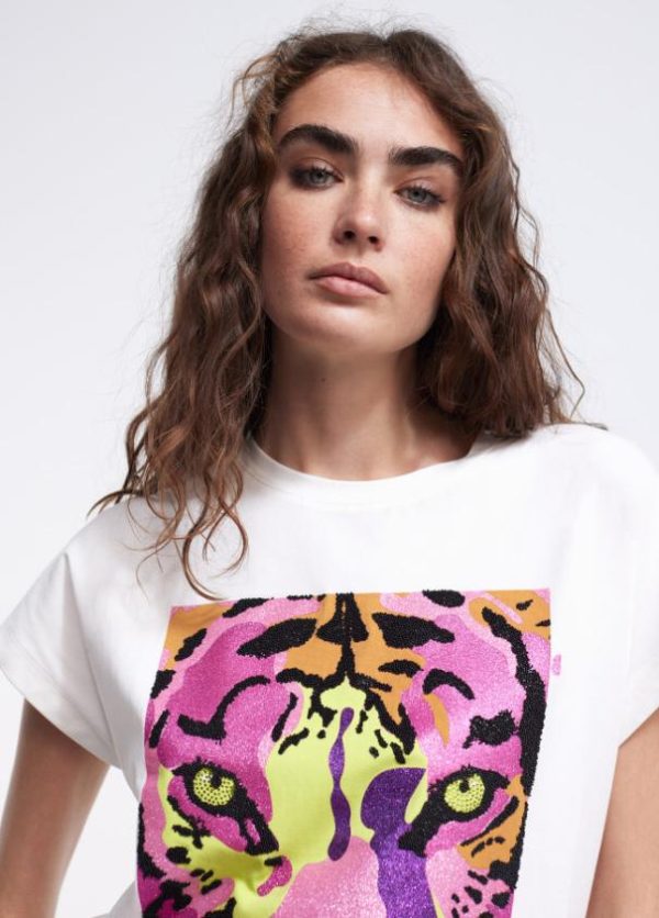 Camiseta de cuello caja y manga corta. Posicionado frontal de tigre multicolor.