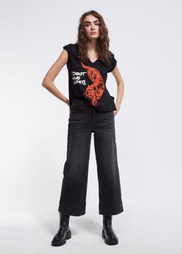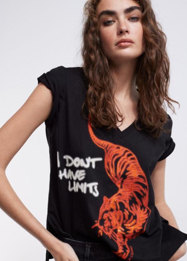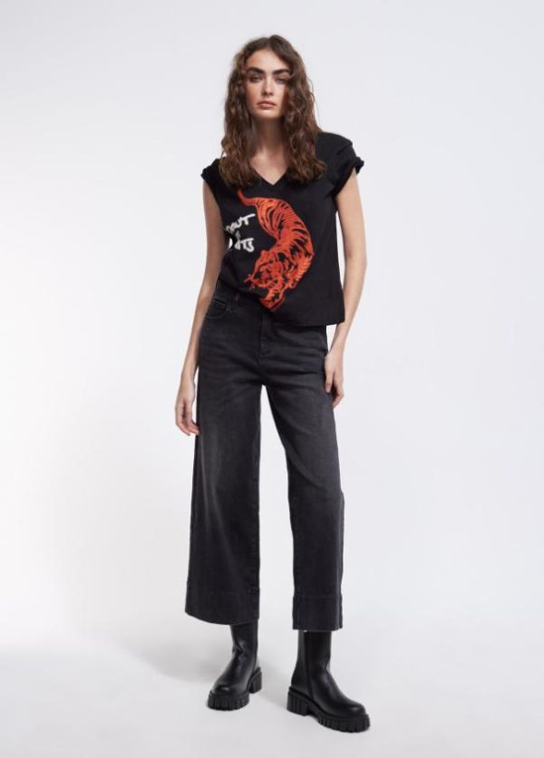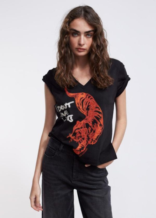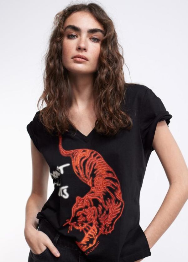 Camiseta de manga corta y cuello pico. Posicionado frontal tigre en strass a contraste.