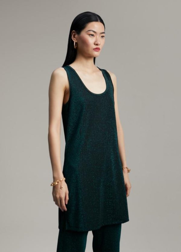 Top largo de tirante ancho. Punto lúrex. Aberturas laterales en bajo.