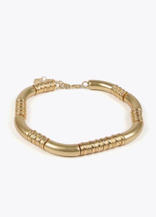 Collar de piezas doradas con cierre ajustable y detalle letras logo.