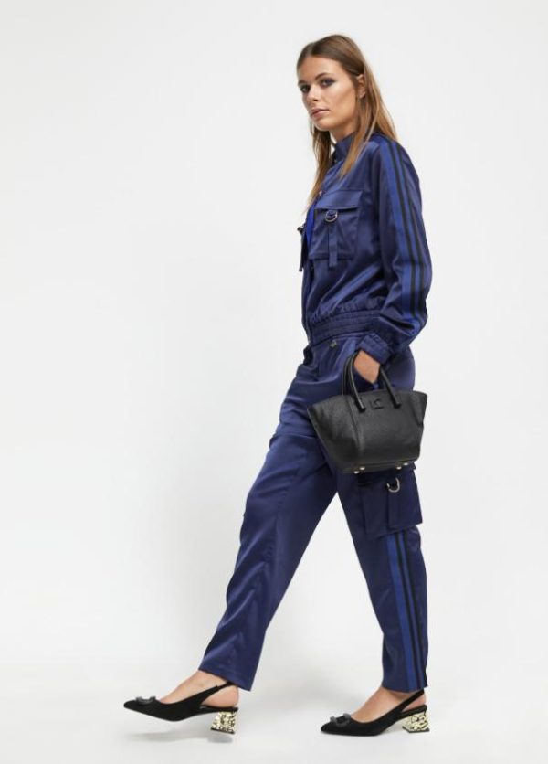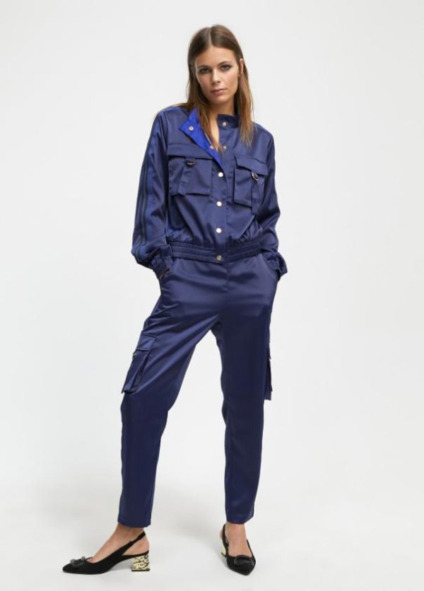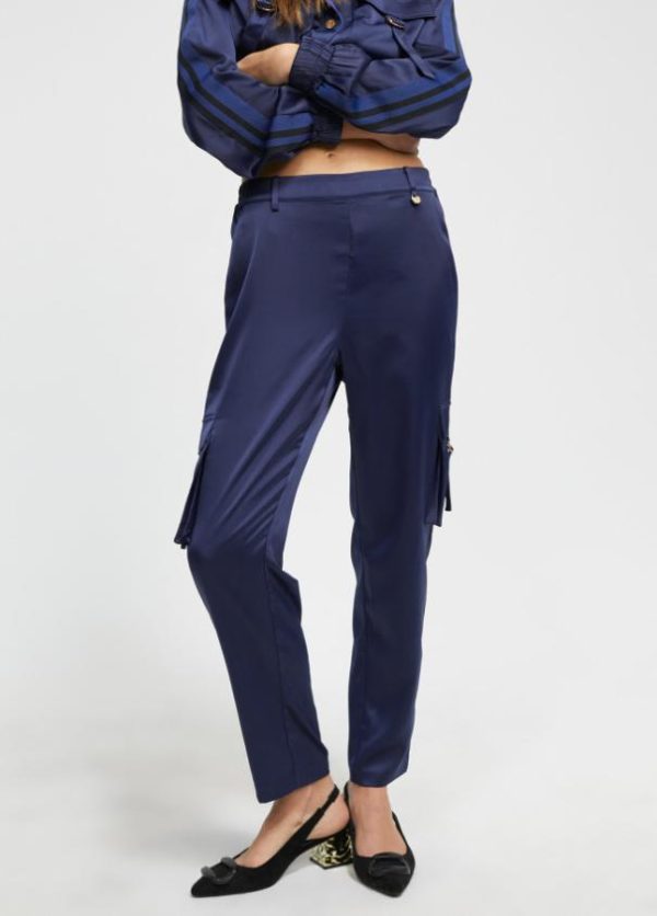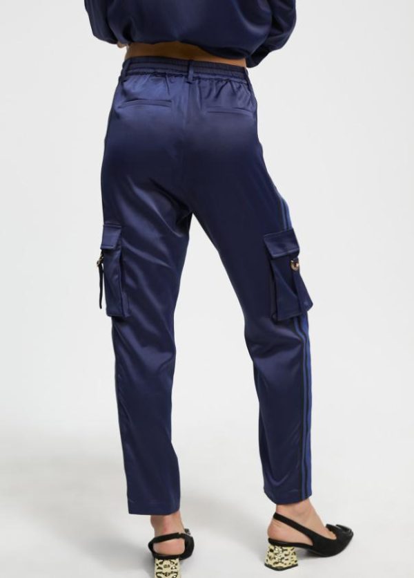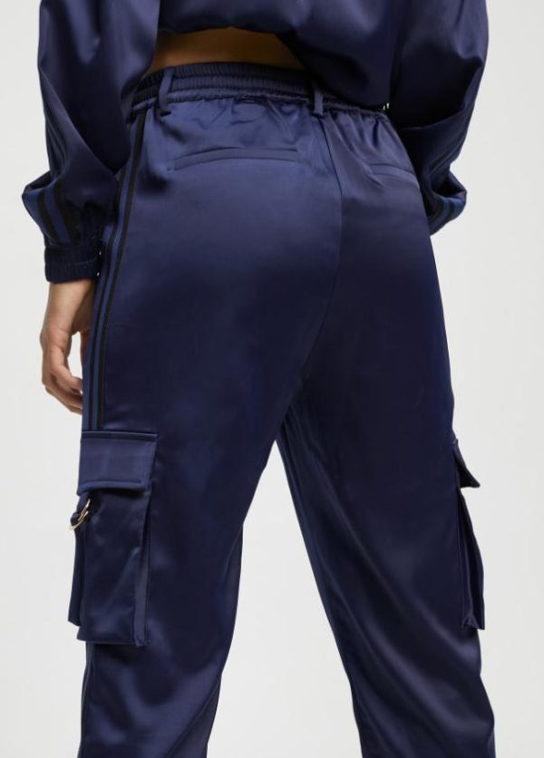 Pantalón tipo cargo con efecto satinado. Bolsillos en lateral piernas con detalle hebilla metálica. Cintura ajustable. Detalle de cinta en rayas a tono en lateral perneras. Falso bolsillo de vivo en espalda.