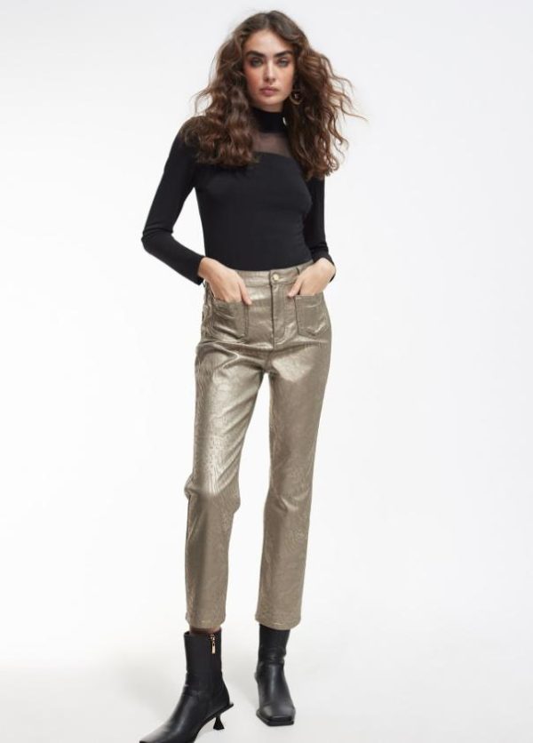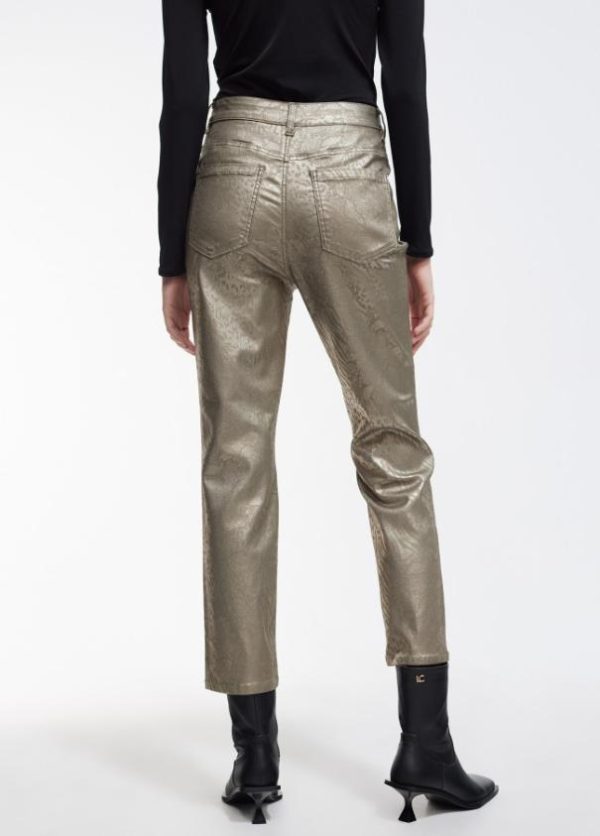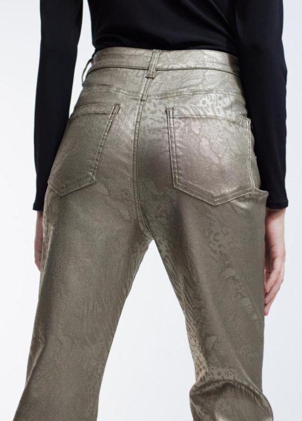 Pantalón recto de tiro medio y efecto lavado de estampado animal. Bolsillos plastrón en delantero y espalda. Cierre frontal con cremallera.