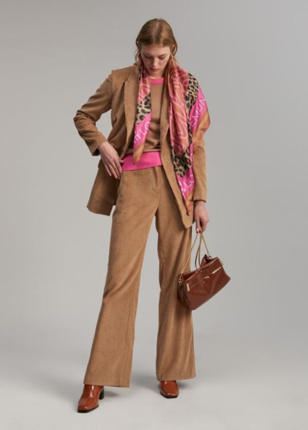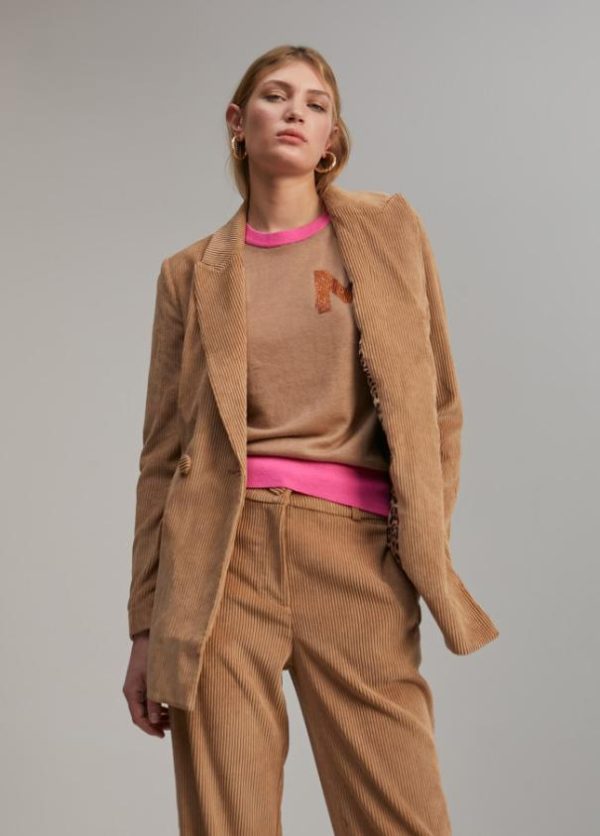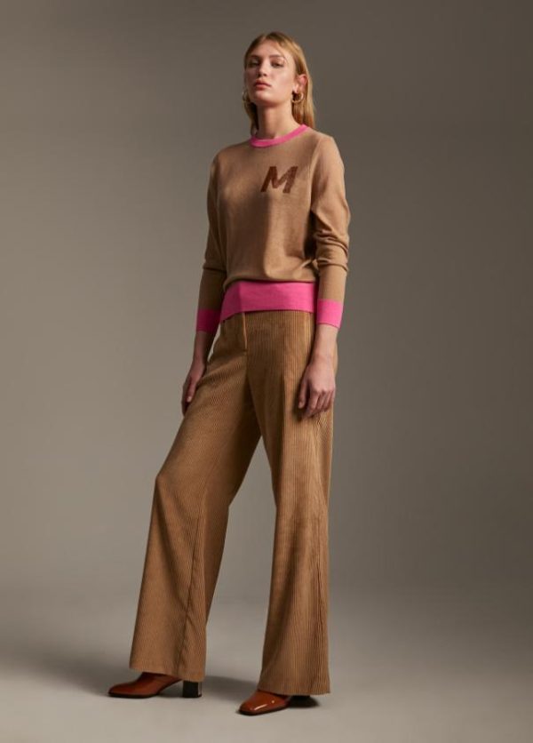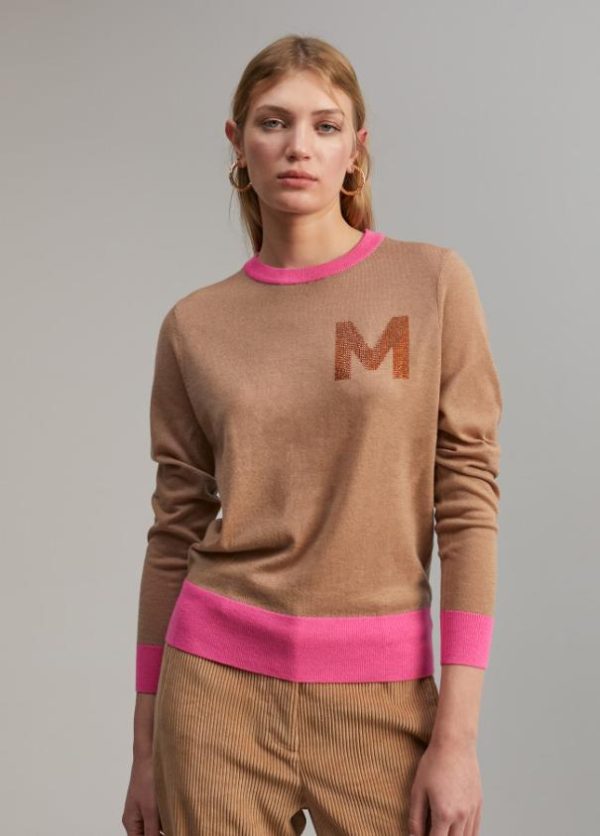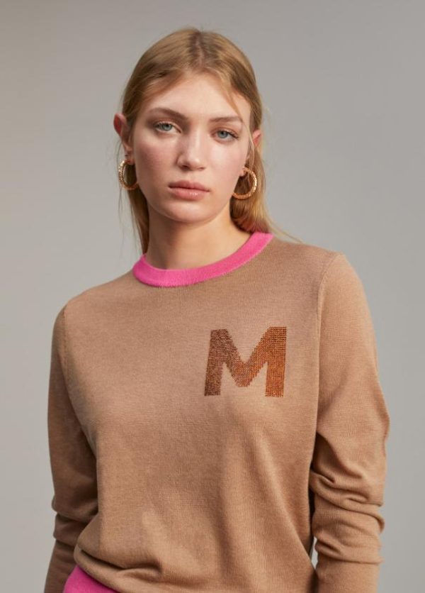Jersey de cuello redondo y manga larga con acabados en rib contrastados. Detalle de M en pedrería de strass en frontal lateral.