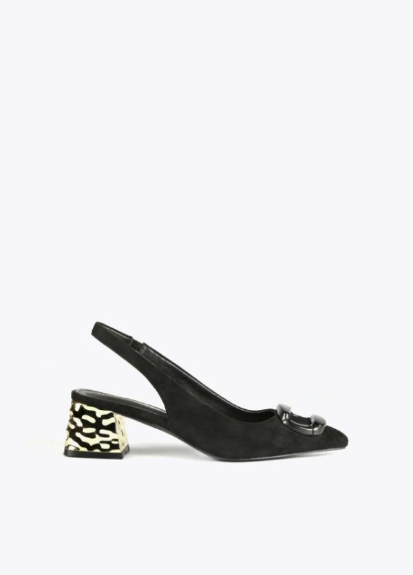Zapato tipo salón abierto en efecto terciopelo con tacón medio dorado y grabado. Detalle hebilla en parte superior y plantilla logotipada.