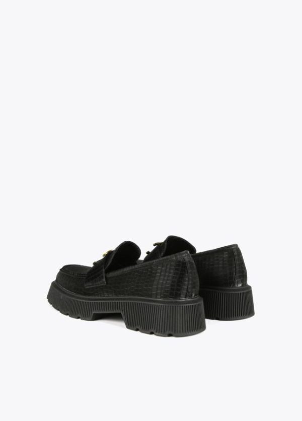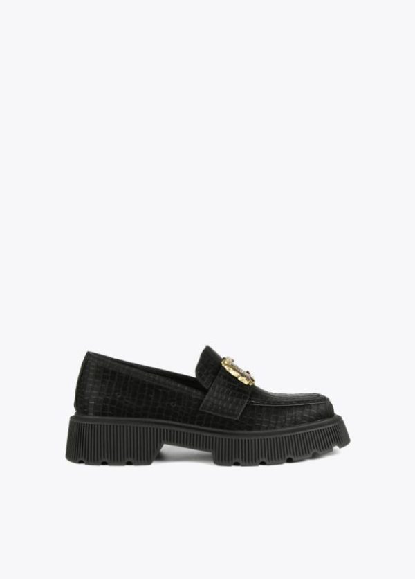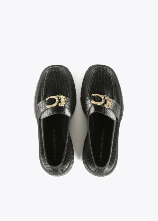 Zapato tipo mocasín negro de piel efecto cocodrilo y mega logo animal dorado en parte frontal. Plantilla logotipada.